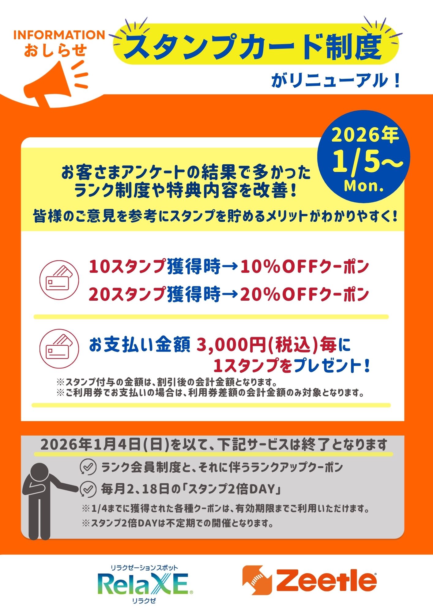 Zeetleアプリのリラクゼスタンプカードの仕様が変更になります。